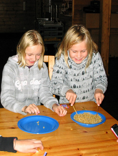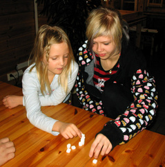 KKT:n sisäradalla Liinu ja Henna rakentamassa tornia sokeripaloista.