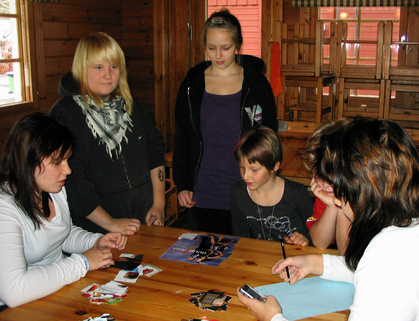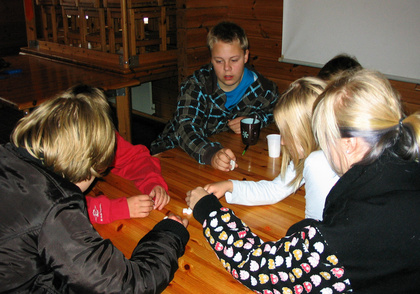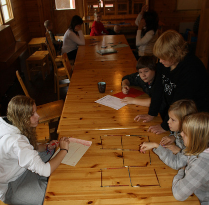 Suvin ja Johannan rastilla kasattiin palapeliä. Iitu, Jolle, Riina ja Sampo tehtävää suorittamassa.