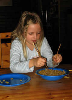 Aleksi laittaa syömäpuikoilla makaroneja lautaselta lautaselle.